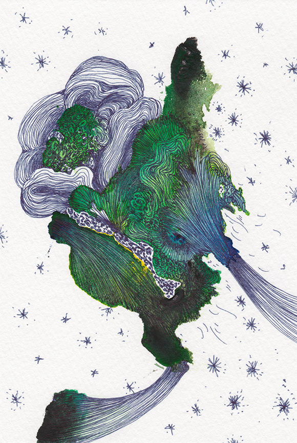 Traveling with shooting stars, 2016, Watercolor and Pen on Paper, 5.8 x 3.9 in. / 148 x 100 mm [#SS16DW006]