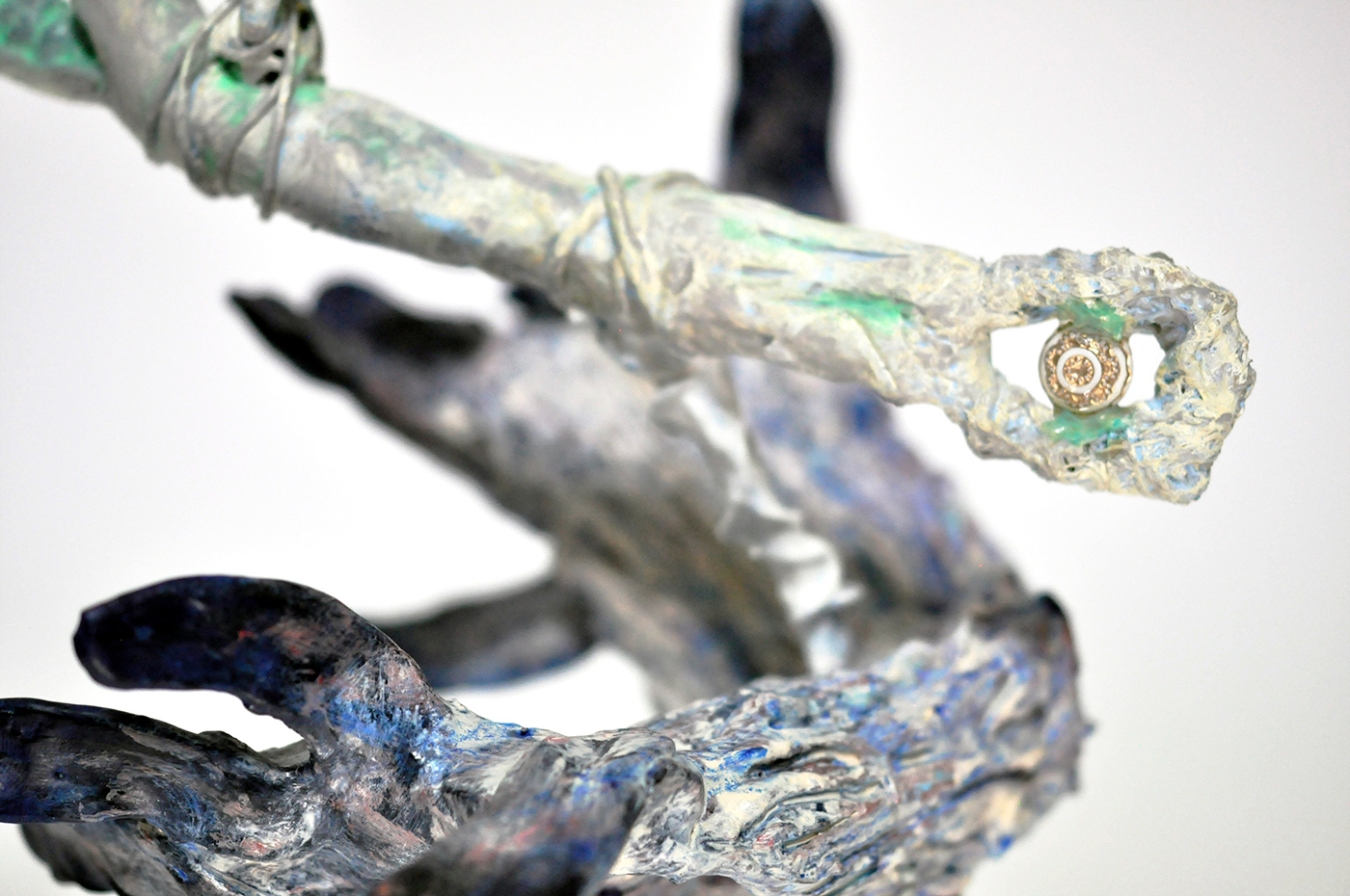 Original Clay Sculpture Artwork - Bird [#SS20SC003] 2020, Oil, Glue, an Acrylic Bead, Hemp String, and Steel Wire on Stone Powder Clay